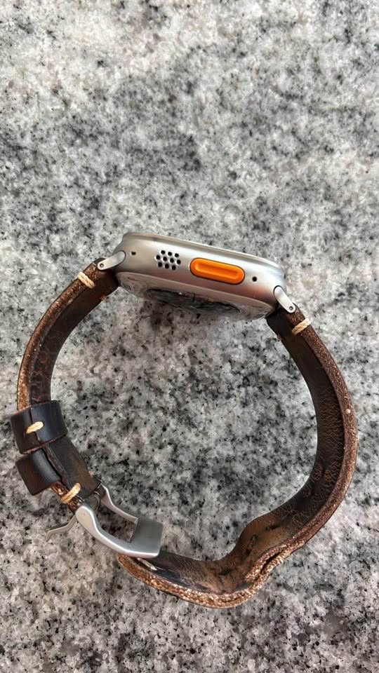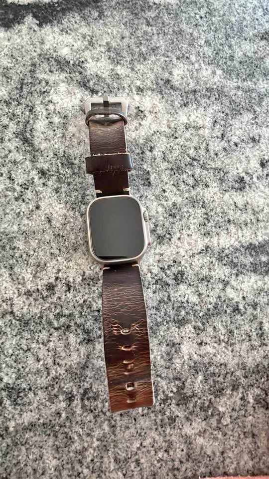 Titanium Apple Watch Ultra with brown leather strap. 49mm size. In good condition with some wear on the strap. The watch is functional and has no visible damage on the screen.